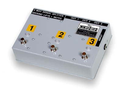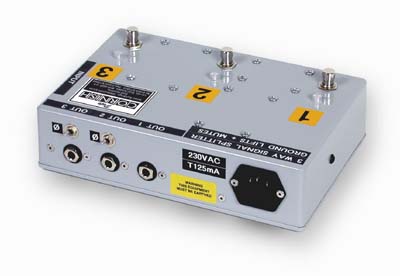 Feeds up to three amps (ensure all grounded to AC power): low Z Balanced outputs allows the use of long cables without loss of Tone or Level and without introducing any “ground loop hum”. Outputs 1, 2 and 3 are floating and will prevent ground loops occurring: please ensure your amps are connected to a reliable power ground at all times. All three outputs are identical in signal level so there will be no difference in performance by changing outputs. All Outputs can be used to drive amps via Mic Tie Lines for studio applications using the appropriate T-R-S / XLR and XLR / Mono Jack adaptors which are available to order. A Footswitch controls each Output and the selected channel is active when the indicator light is on.