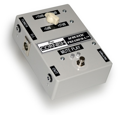 The pickup output should be connected directly to the Preamp input with a short, low loss, screened cable; the Preamp output can now be fed to any effects or volume pedals (if used) and then on to the amplifier. The Preamp gain control should be adjusted to a comfortable signal level with the amplifier volume control set to about 50%. Alternatively the gain can be set to match the signal level of another instrument (e.g. Electric or Bass Guitar) when they are both fed into the same amplifier.