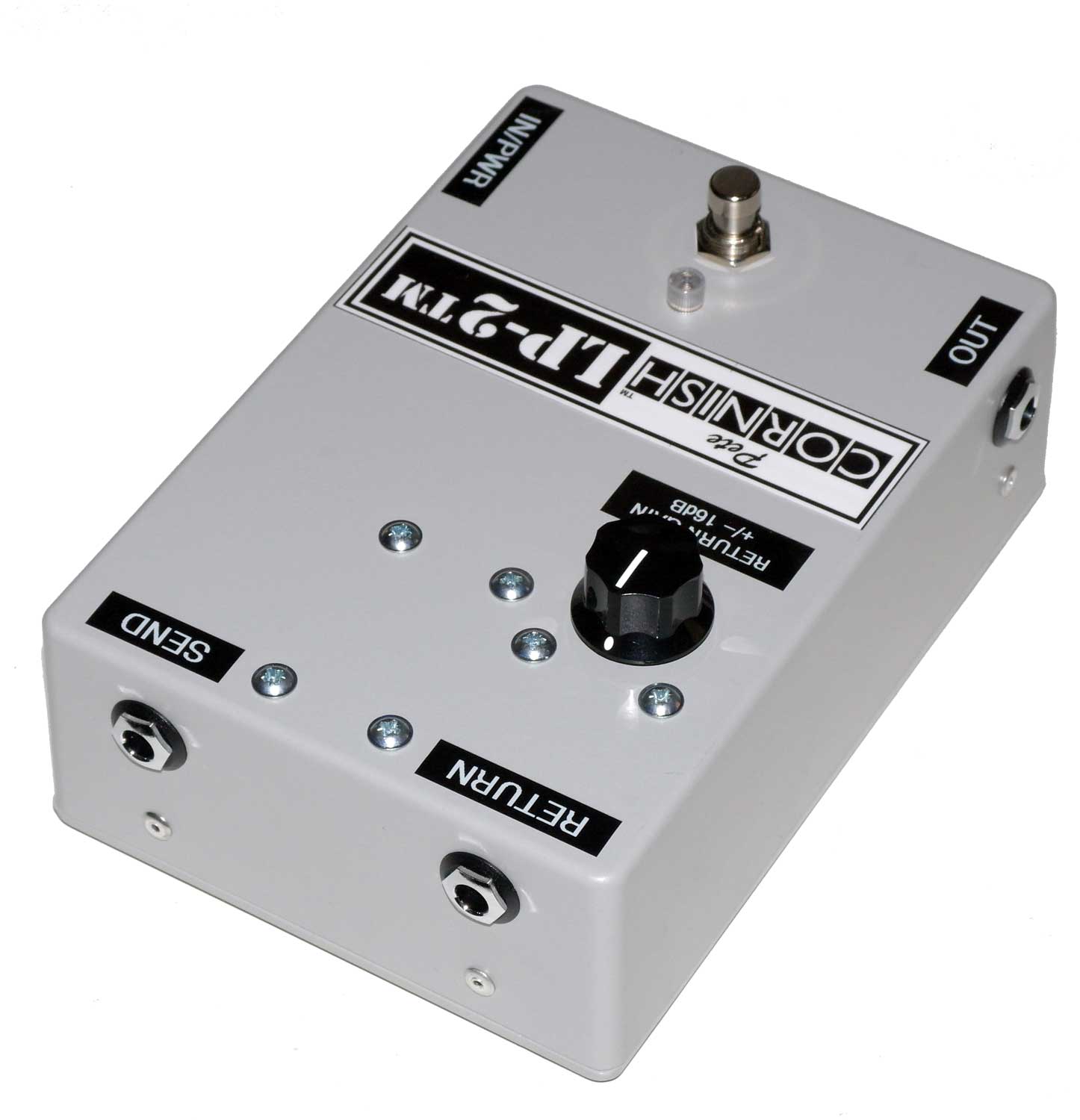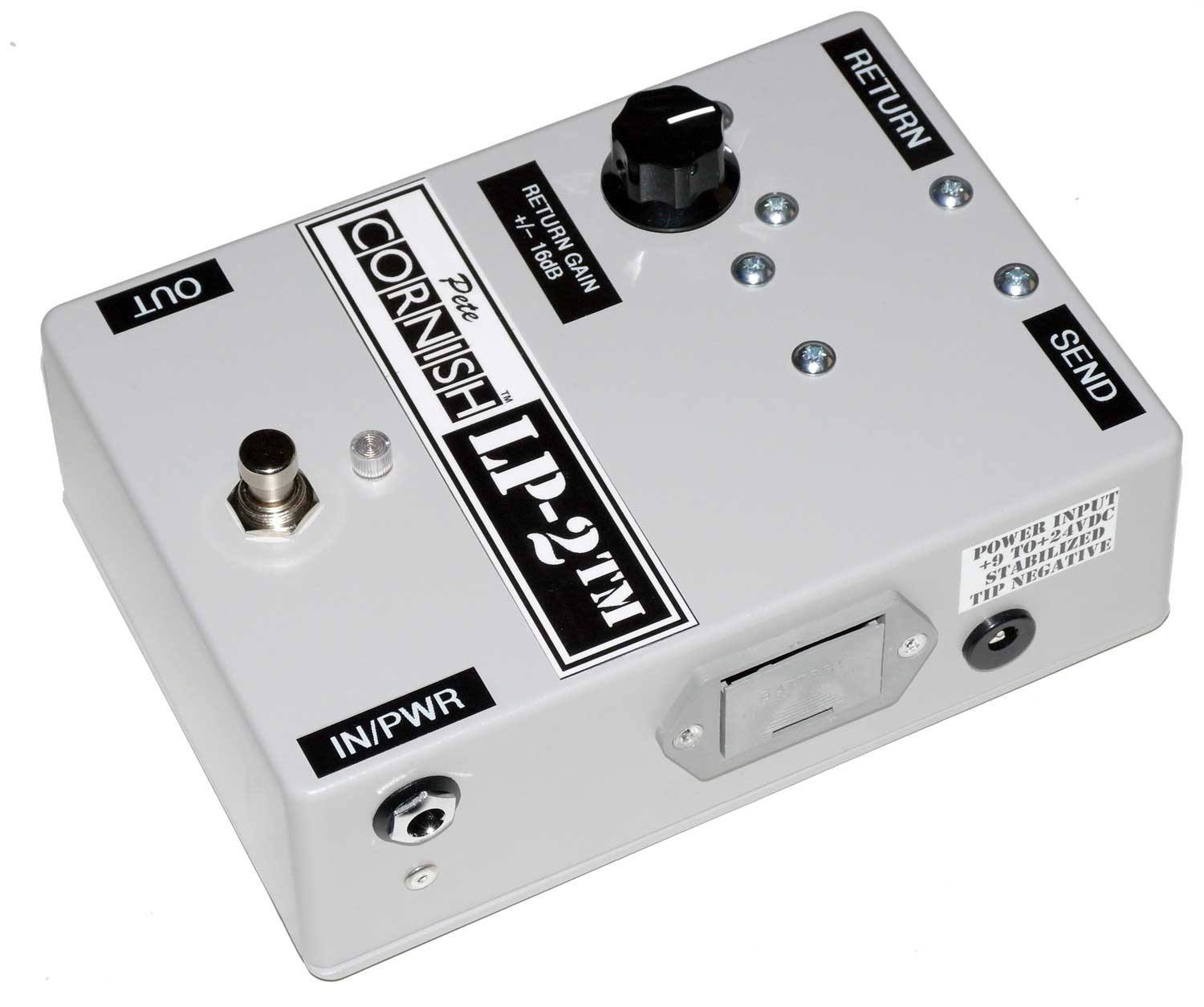 The LP-2™ INPUT features our world class unit gain buffer and line driver type LD-1™. The SEND is isolated and ground lifted. The RETURN features our well established variable gain stage with gain variation from -16dB to 0dB (unity) to +16dB. The footswitch alternates between bypass (LED off) and loop (LED on) and in active mode the RETURN signal from the external effects pedal is sent to the OUTPUT with any boostor cut that has been added by the RETURN GAIN control. No gain boost is applied to the SEND feed, which is at guitar level and so should not be used for signal matching to Line Level equipment such as rack effects etc.