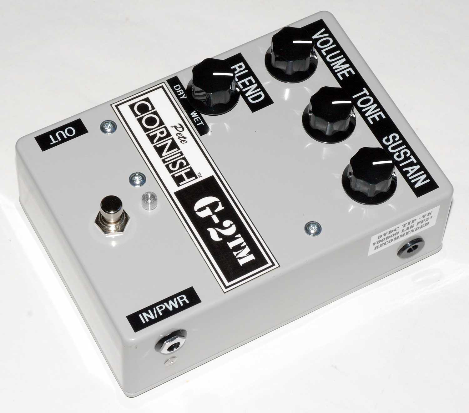 Please note that there is no battery in the Grey Blend series as the space is used for the Blend Circuit. I can confirm that the G-2 signal tone and level is exactly the same as previous versions when the Blend Control is set fully clockwise. I have not altered the G-2 sound, just added a Blend function to the output. Set up is straightforward : turn Blend fully clockwise; engage G-2 and set Sustain, Tone to taste: adjust Volume to match bypassed signal level - switch back and forth to check that the G-2 volume is identical to the Bypass level. Blend control at 12 o'clock will now mix equal amounts of G-2 and Bypassed signal (labelled WET and DRY) and varying amounts of wet/dry can be dialed in using the Blend control.
