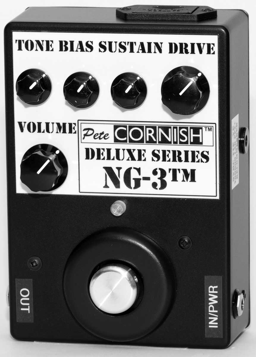 The first stage is a Linear DRIVE with up to +26dB of gain feeding the second stage; a stabilised discrete preamp which overloads smoothly when overdriven. The third stage is where the NG-3™ magic takes place; it simulates a tube amp that has been under biased or has suffered serious tube or output transformer failure (the sound just before the fuse blows). The SUSTAIN control adjusts the signal level into the third section and can be adjusted from ʻTired Output Tubesʼ to ʻMelted Tubes and Shorted Output Transformerʼ.